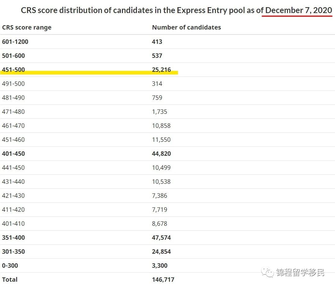 锦程和伙伴们一起来了解一下,2020年至12月7日, 人才池子里排队申请人的分数分布,就能知道自己大概的排名和受邀请的机会了,可以看出在基本达到受提名的分数标准线上最密集是在分数段451-500之间的申请人,现已多达252162名。